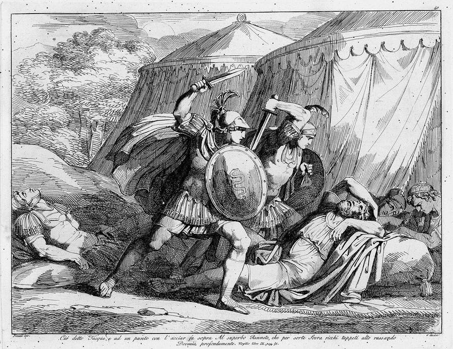 40-La flotte a été sauvée (les navires ayant été métamorphosés en nymphes). Mais Turnus a investi la ville des Troyens. Alors, pendant la nuit, Nisus et Euryale sont partis pour prévenir Énée. Traversant, l'épée à la main, le camp où dorment les Rutules, qui ont trop bu, ils font un grand carnage. D'abord Nisus massacre Rhamnès qui ronflait sur un amoncellement de tapis, puis il égorgera, il coupera des têtes; et Euryale fera de même. Ils ne s'arrêteront qu'au lever du jour. [IX, 324-328]
