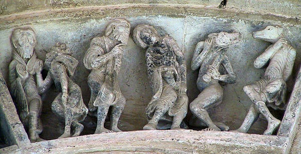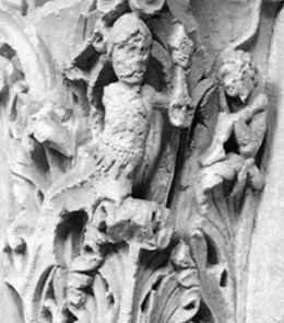 3-Sur le chapiteau de gauche du portail intérieur sud du narthex, un petit personnage, nu et recroquevillé, se bouche les oreilles pour ne pas entendre une sirène à queue d'hippocampe, portant une ceinture à franges et une épée (?), et qui joue de la viole.