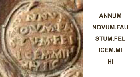 Une autre lampe avec inscription : ANNO NOVO FAUSTUM FELIX TIBI SIT |