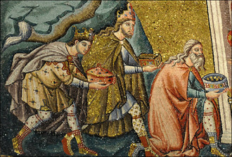 – Selon Matthieu (2, 11) : En Orient, des mages astrologues ont interprété un signe dans le ciel comme l'annonce de la naissance, en Judée, du futur roi des Juifs. S'étant munis d'offrandes rituelles, ils se sont mis en route afin de lui rendre hommage. Ne sachant pas trop où aller, ils se sont arrêtés à Jérusalem pour consulter le roi Hérode, qui leur dit de voir du côté de Bethléem. Le signe céleste réapparut et leur désigna la maison (οἰκία) où Marie était avec l'enfant. Ils s'agenouillèrent et offrirent de l'or, de l'encens et de la myrrhe.
