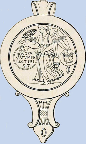 Cette lampe à huile porte, sur le bouclier de la Victoire ailée tenant une palme, la formule : « Annum novum faustum felicem mihi » = Que la nouvelle année me soit prospère et heureuse.Autour de la Victoire sont figurées datte, figue et pomme de pin, ainsi que trois monnaies que l'on s'échangeait comme étrennes : une figure de Janus (le mois de Janvier), une dextrarum junctio devant un caducée (symbole des relations honnêtes dans le commerce) et une Victoire (symbole de paix, les portes du temple de Janus ayant été refermées).