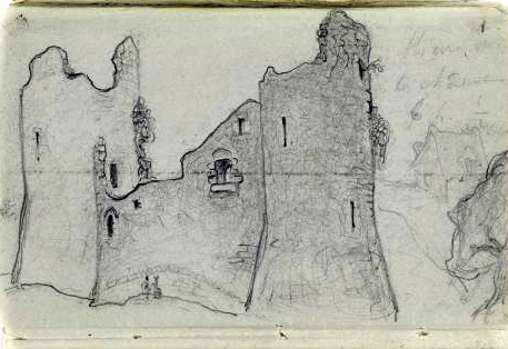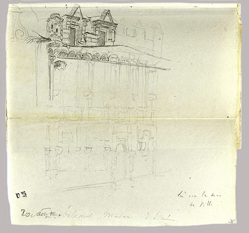 "Je suis à Étampes, j'y ai trouvé une espèce d'antiquaire, ancien officier de la garde, ami de Paul Lacroix, nommé M. Grandmaison, à qui appartient ce fameux donjon d'Étampes que tu connais, et qui veut me montrer toutes les ruines des alentours. Elles sont assez nombreuses et fort belles. Nous devons aller voir demain le Temple, ancien monastère écroulé sur la montagne. Il y a ici de belles églises romanes. Une (Saint-Martin) a une tour penchée comme Pise. Il serait possible que j'allasse de là à Fontainebleau voir le château, s'il se présente une bonne occasion ; mais les vacances rendent les voitures chères et rares. — Écris-moi toujours à Melun. J'ai passé hier une admirable journée à Pithiviers et aux environs. Yèvres-le-Châtel, qui est à deux lieues et où je suis allé à pied avec mes souliers percés, contient à lui seul un couvent et un château, ruinés, mais complets. C'est magnifique. Je dessine tout ce que je vois. Tu en jugeras." (lettre du 22 août 1834).