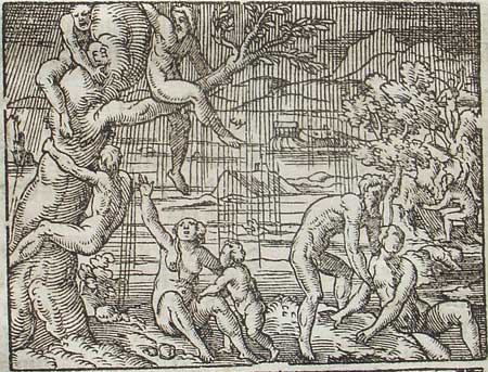 | Virgil Solis (1514-1562), Illustration pour le livre I des Métamorphoses d'Ovide Les humains assistent impuissants à la montée des eaux dans lesquelles tous vont périr. |