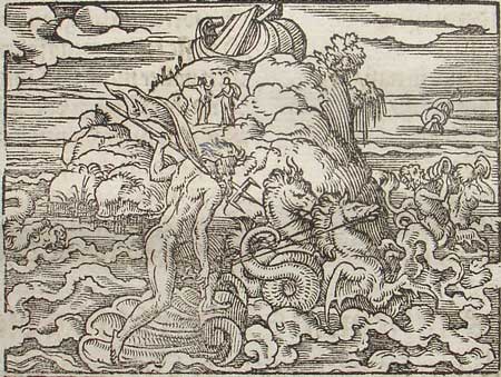 Virgil Solis (1514-1562) Sur le mont Parnasse, devant leur "arche" échouée au sommet, Deucalion et Pyrrha sont les deux seuls survivants. Poséidon parcourt les eaux, qui ont commencé à baisser. |