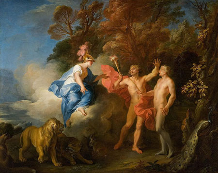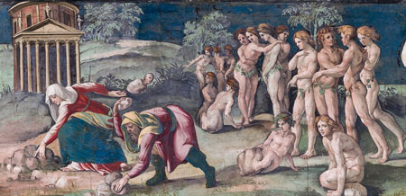 | Conseilés par Thémis, Deucalion et Pyrrha jettent des pierres pour recréer l'humanité | |