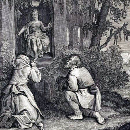 | Deucalion et Pyrrha consultent Thémis, qui va leur dire comment recréer la race humaine Traduction de Pierre Du Ryer, 1702 |