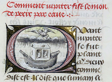 | "Parva ratis" (une petite embarcation) : c'est, selon Ovide, ce qui leur a permis de survivre. | Deucalion et Pyrrha dans leur "arche". Enluminure de l'Ovide moralisé. Ms Français 137, fol.6v – XVe siècle, BnF |