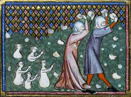 Il leur suffira de ramasser des pierres et de les jeter derrière eux pour que naissent des hommes et des femmes. Enluminure de l'Ovide moralisé Ms 04, fol.28 - 1325 Bibl. municipale de Rouen |