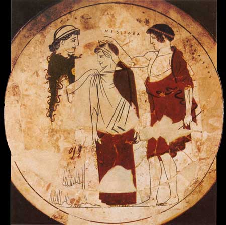 Prométhée, fils de Japet, fut le premier à façonner des hommes avec de l'argile. Ensuite Vulcain, sur l'ordre de Jupiter, fit, en argile également, une représentation de la femme, à laquelle Minerve insuffla la vie; les autres dieux lui firent chacun un don et, pour cette raison, lui donnèrent le nom de Pandore. Elle fut donnée en mariage à Epiméthée, frère de Prométhée, et ils eurent pour fille Pyrrha, que l'on dit être la première mortelle. |