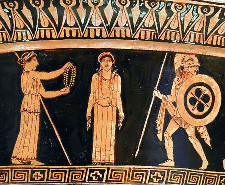 | La création de Pandore - Cratère attique en calice -450 - British Museum | Kylix, par le peintre de Tarquinia, vers 465. British Museum. Athena et Héphaistos achèvent la création de Pandora (appelée Anesidora) |