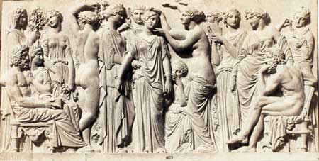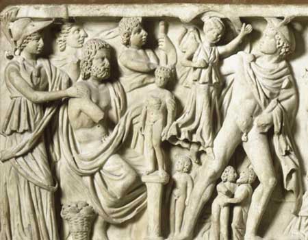 Sarcophage trouvé à Arles. Musée du Louvre Athéna et Prométhée achèvent la création du premier homme en présence de Mercure |