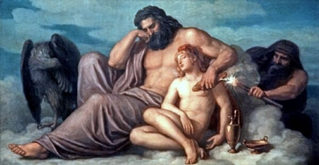| Pendant que Zeus, tenant une lampe, somnole près de Ganymède, Prométhée allume une tige de férule. Christian Griepenkerl (1839-1916), 1878, Augusteum d'Oldenburg, grand escalier. |