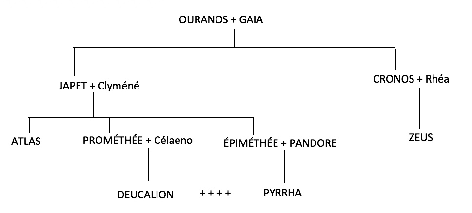 Epiméthée et Pandore eurent une fille, Pyrrha (la Rouquine) ; un fils de Prométhée, Deucalion, l'épousa.