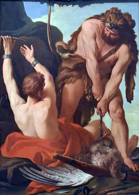 Restait à punir Pométhée de sa désobéissance. Zeus ordonna à Vulcain de l'attacher à un rocher avec des liens d'acier et ordonna à un aigle de venir chaque jour lui ronger le foie, qui renaîtrait chaque nuit.