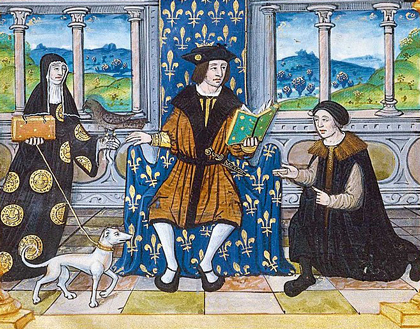 | Enluminure de dédicace du manuscrit de L'Institution du prince, vers 1519 (Bibliothèque de l'Arsenal, MS-5103, fol. 1 v°) |