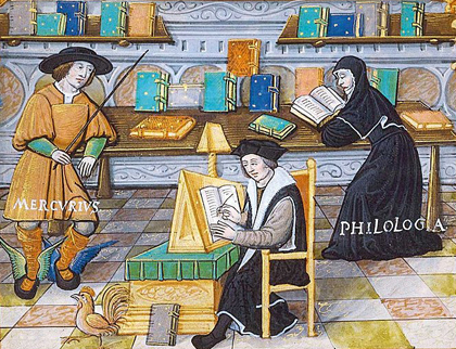Guillaume Budé est au travail dans sa bibliothèque, dans laquelle se trouvent Mercure et Philologia. Dans son poème allégorique De Nuptiis Philologiae et Mercurii, Martianus Capella, au +Ve siècle, a imaginé que Mercure (le dieu de la rhétorique grâce auquel le savoir se transmet) a obtenu de Jupiter l'autorisation d'épouser Philologie (une mortelle d'une curiosité insatiable qui passe son temps à étudier). |