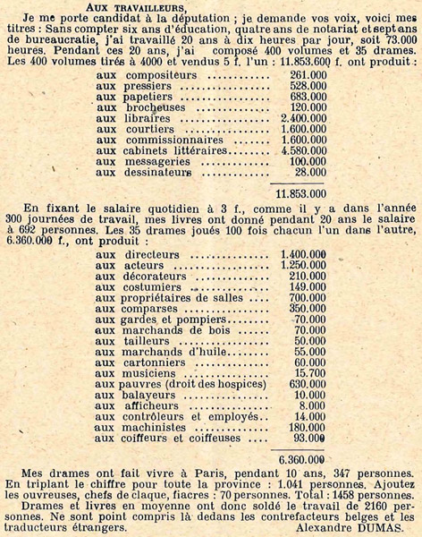 Sans compter 10 ans d’éducation, 4 ans de notariat et 7 années de bureaucratie, j’ai travaillé pendant 20 ans à 10 heures par jour ou 73.000 heures. Pendant ce temps j’ai composé 400 volumes et 35 drames. Les 400 volumes, tirés à 4000 et vendus 5 francs chacun, ont rapporté, auteur non compris, 11.853.000 francs aux compositeurs, aux pressiers, aux papetiers, aux brocheuses, aux libraires, aux commissionnaires… En fixant le salaire quotidien à 3 francs, comme il y a 300 journées de travail, mes livres ont donné pendant 20 ans le salaire à 692 personnes. Les 35 drames joués 100 fois chacun ont produit 6.200.000 francs, auteur non compris, et ont rapporté aux directeurs, aux acteurs, aux décorateurs, aux costumiers, aux gardes et pompiers, aux marchands d’huile et de gaz, aux afficheurs, aux balayeurs, aux contrôleurs, aux coiffeurs et coiffeuses… Mes drames ont fait vivre à Paris pendant 10 ans 347 personnes; en triplant ce chiffre pour la province, on a pendant 10 ans 1041 personnes. Ajoutant les ouvreurs, les claqueurs, les fiacres : 70 personnes. Total : 1458 personnes. Drames et livres, en moyenne pendant 15 ans, ont soldé le travail de 2150 personnes. Ne sont pas compris là-dedans les contrefacteurs belges et les traducteurs étrangers.